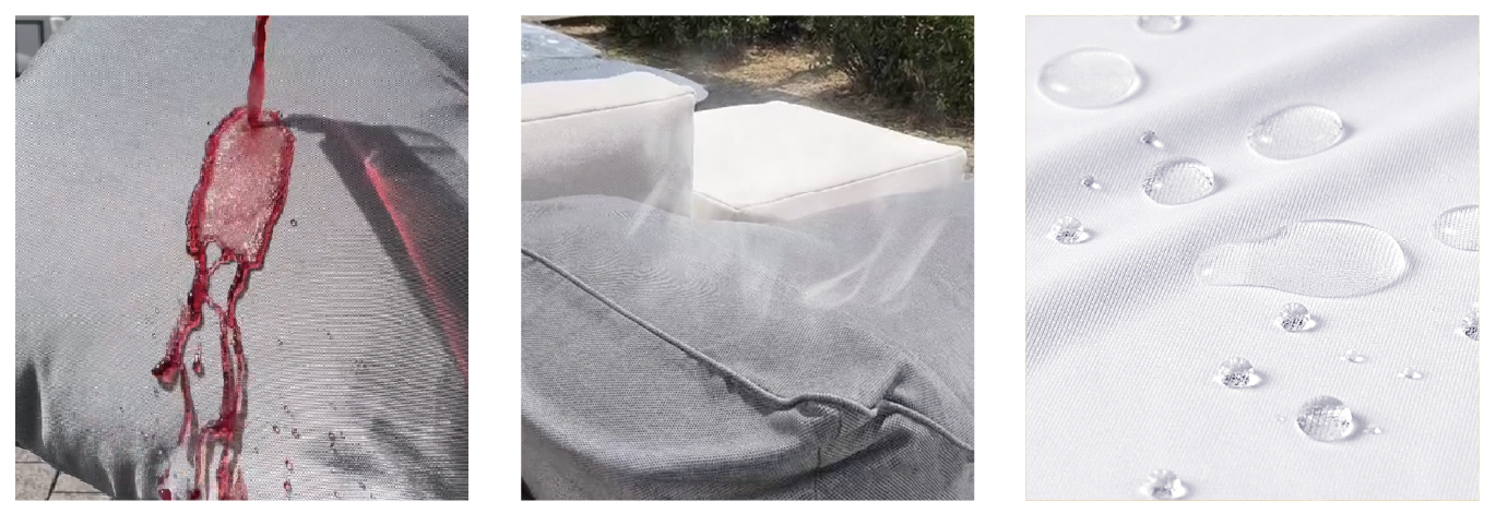 Der hochwertige Olefin-Stoff der Finqa-Sofas ist nach dem Öko-Tex Standard 100 zertifiziert. Er ist nicht nur wasserabweisend und schnelltrocknend, sondern auch äußerst widerstandsfähig: 15.000 Reibungen im Außeneinsatz ohne Pilling und 1.200 Stunden direkte Sonneneinstrahlung ohne Farbveränderung.